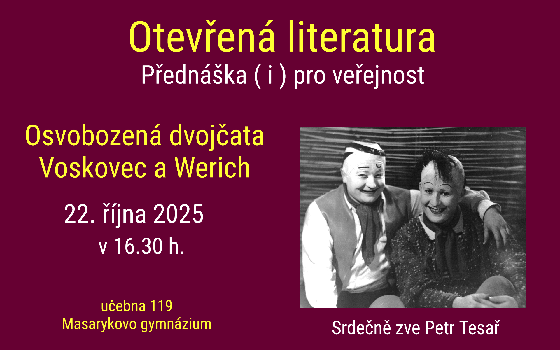 Srdečně zveme na další chystané akce. V pondělí 13. října 2025 se uskuteční na schodech v budově Masarykova gymnázia Šíráníčko, které je zaměřeno na autorskou tvorbu studentů. Ve středu 22. října proběhne další z přednášek v rámci cyklu Otevřená literatura. Tentokrát se budeme věnovat Osvobozenému divadlu a pánům Voskovcovi a Werichovi. Přednášku povede Petr Tesař. Těšíme se na literární podvečery.