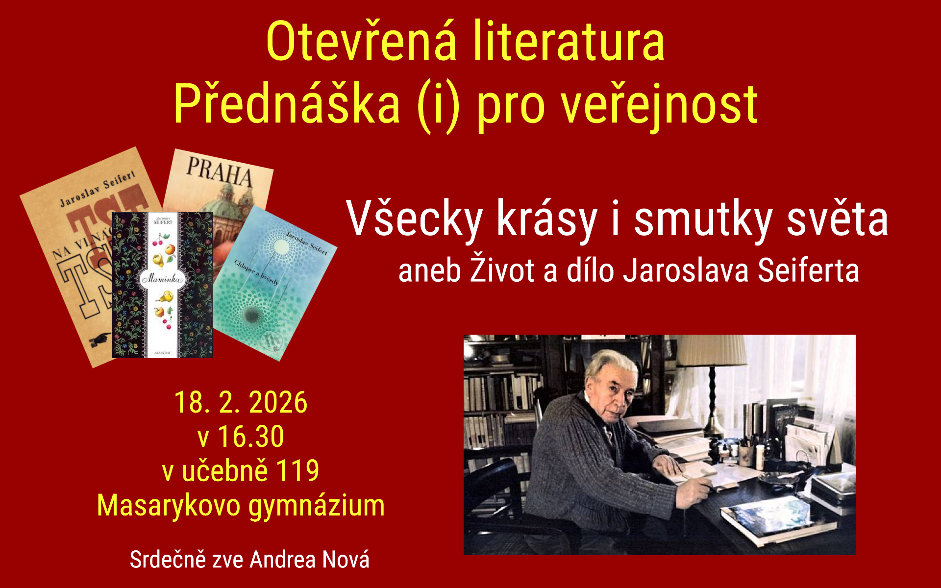 Cyklus Otevřená literatura bude pokračovat přednáškou s názvem Všecky krásy i smutky světa. Zaobírat se budeme životem a dílem českého básníka a spisovatele Jaroslava Seiferta, nositele Nobelovy ceny za literaturu. Přednáška je určena nejen pro naše studenty, ale je otevřena i pro zájemce z řad široké veřejnosti. Srdečně zveme a těšíme se na vás 18. února 2026 v 16.30 h.