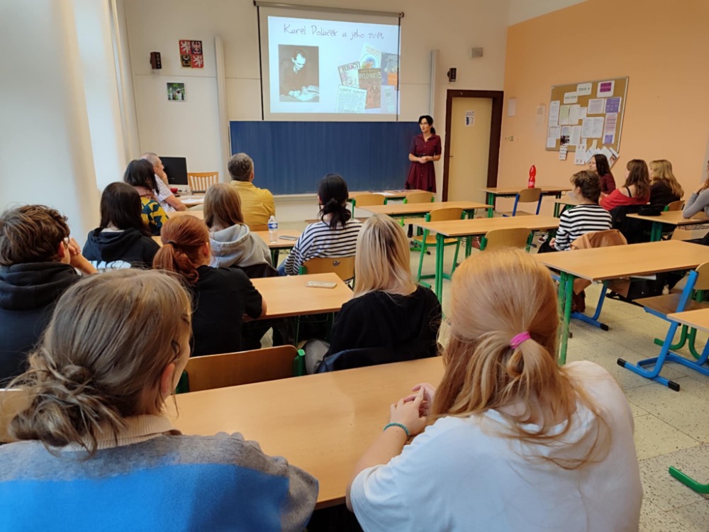 Ve středu 24. září 2025 proběhla již čtvrtá přednáška pro veřejnost z cyklu, který jsem nazvala Otevřená literatura. Tentokrát jsme se podívali do světa Karla Poláčka, nechali se okouzlit jeho literárním humorem a také sledovali jeho životní cestu s nelehkým koncem v době druhé světové války. Děkuji všem, kteří se zúčastnili. Speciální dík patří mému kolegovi Petru Tesařovi a studentce 4. A Tereze Šavlové, kteří se mnou četli ukázky z děl Karla Poláčka. Příště chystáme přednášku, která ponese název Osvobozená dvojčata a bude se zaobírat Jiřím Voskovcem a Janem Werichem. Přednášku povede Petr Tesař a už teď se těšíme na další příjemný literární podvečer.