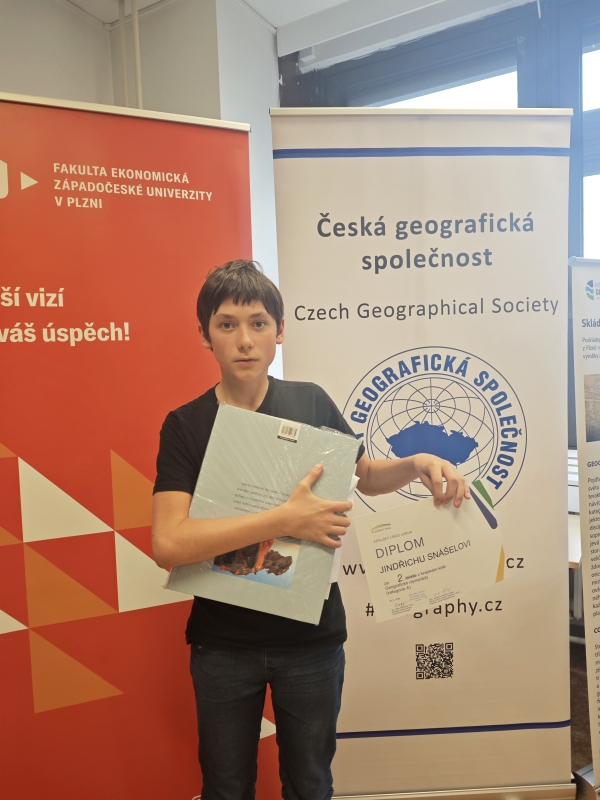 Ve středu 25. 3. 2026 se v prostorách Ekonomické fakulty Západočeské univerzity v Plzni na Borech konalo krajské kolo Geografické olympiády. Naši školu reprezentoval v kategorii A Jindřich Snášel z primy B. Jindra absolvoval celkem tři testy a nakonec obsadil úžasné druhé místo. Gratulujeme!