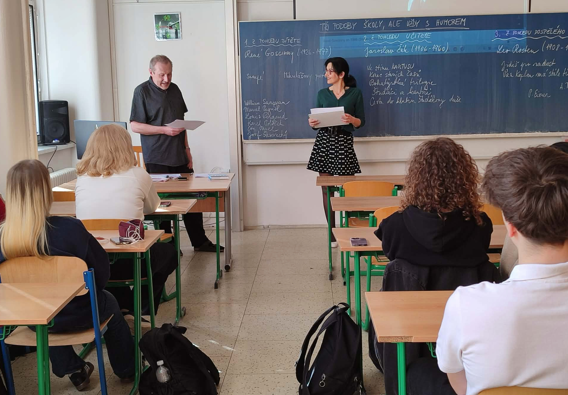 V pondělí 30. března 2026 proběhla již sedmá přednáška z cyklu Otevřená literatura. Jsem moc ráda, že cyklus přednášek pro veřejnost, který jsem zahájila v lednu 2025, se takto úspěšně ujal a že si našel své příznivce. Ráda bych poděkovala svému kolegovi Petru Tesařovi za skvělou spolupráci. Ta sedmá přednáška, kterou vedl právě Petr Tesař, se věnovala literárnímu humoru se školní tematikou. Pro letošní školní rok to byla přednáška poslední, ale už teď se těšíme na pokračování Otevřené literatury v příštím školním roce. Prozradím, že první zářijová přednáška se bude věnovat Karlu Čapkovi.