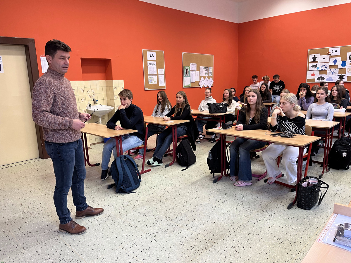 Dne 20. 11. 2025 navštívil naši školu redaktor frankofonní redakce Radio Prague International, pan Guillaume Narguet. Studentům francouzštiny představil Český rozhlas a jeho historii od počátku vysílání a Radio Prague International jako bohatý zdroj cizojazyčných materiálů o nám blízkých tématech, a to jak v psané, tak v audio podobě. Na závěr došlo i na otázky studentů, které se týkaly např. srovnání české a francouzské kultury, jazyka apod.