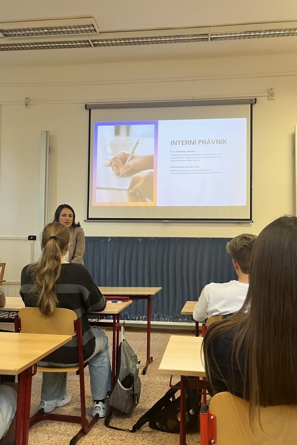 Dne 18. listopadu 2025 navštívila absolventka Masarykova gymnázia JUDr. Jana Dušková seminář společenských věd pana učitele Tesaře.