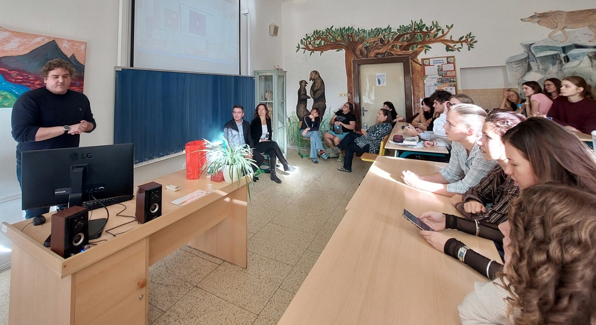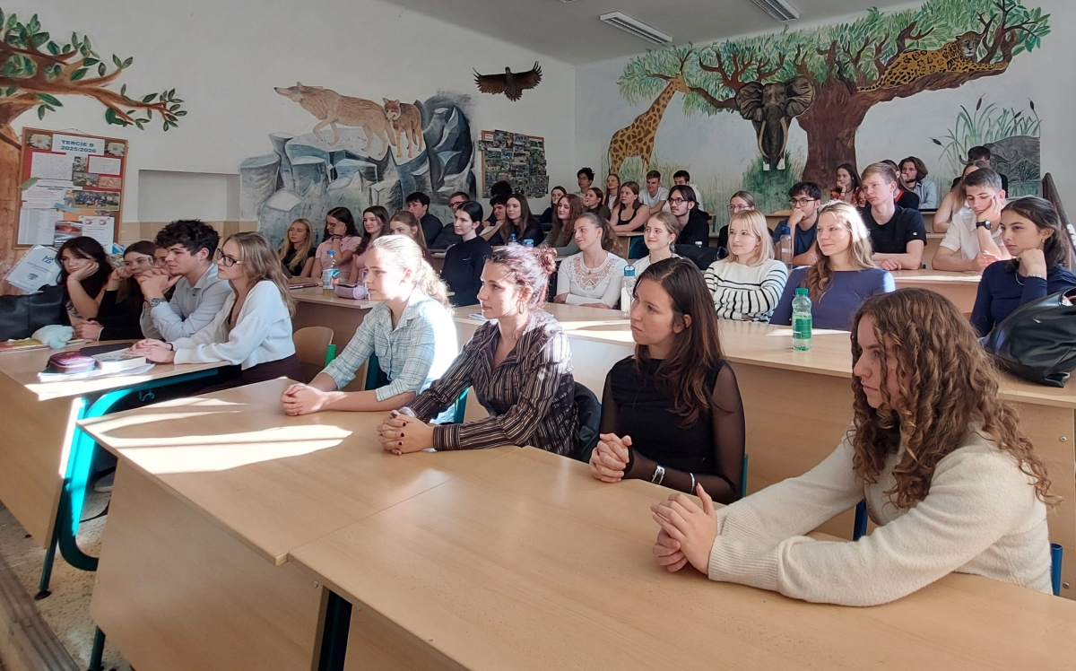 Dne 21. 10. 2025 bylo naše gymnázium poctěno diplomatickou návštěvou z Velvyslanectví Spojeného království Velké Británie a Severního Irska. Studenti ze čtvrtých ročníků a oktáv dostali příležitost klást otázky a debatovat v anglickém jazyce s panem Lukášem Jirouskem z obchodního oddělení ambasády, dále s vedoucí konzulárního oddělení, paní Janou Walkerovou, a v neposlední řadě jsme měli možnost hovořit i s britským diplomatem z politického oddělení, panem Robertem Smithem.