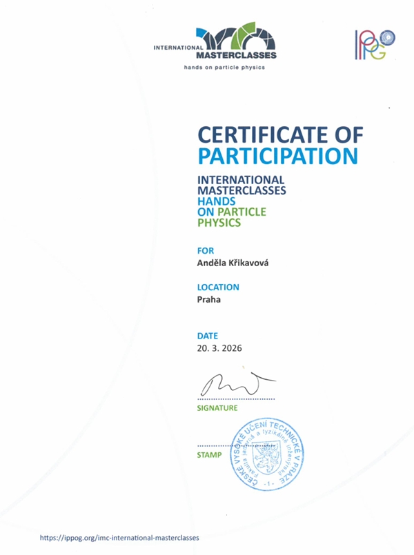 Studentka Anděla Křikavová (3. B) se zúčastnila dvou mezinárodních fyzikálních Masterclass, které proběhly 13. a 20. března 2026 ve spolupráci s odborníky z Fyzikálního ústavu AV ČR.